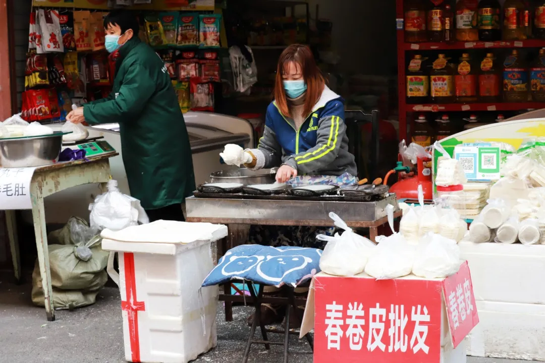 俗話說:“民以食為天”,而那些地地道道的美食就藏在深街小巷,穿梭在老街的農(nóng)貿(mào)市場里,熙熙攘攘的人群中,吆喝聲、討價還價聲、手機付款聲此起彼伏。放眼望去,有一家豎著春卷皮批發(fā)招牌的小店門口排起了長隊,店老板夏女士說:“春卷皮吃法簡單方便,一年四季都很受孝感人青睞,現(xiàn)在臨近春節(jié),來買春卷皮的人特別多,每天能銷幾千張?!?/p>