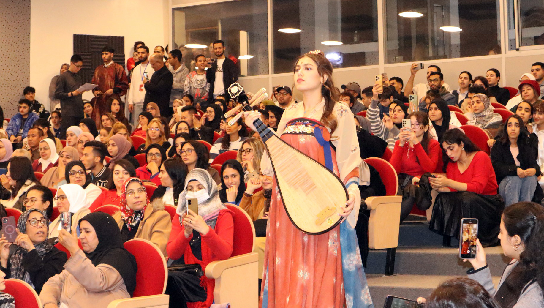音樂節(jié)目中,孔院合唱團(tuán)帶來的《仰望星空》和《年少的你啊》通過溫暖的旋律和真摯的歌聲,唱出了青春的活力和對(duì)未來的希望。孔院樂器社表演的《笛韻箏音》將古箏與笛子優(yōu)美合奏,為現(xiàn)場(chǎng)觀眾呈現(xiàn)了一場(chǎng)中國傳統(tǒng)音樂的聽覺盛宴。值得一提的是,孔院師生演唱的摩洛哥歌曲《dirou niyya》,將中國春節(jié)的喜慶與摩洛哥音樂完美結(jié)合,瞬間點(diǎn)燃了現(xiàn)場(chǎng)觀眾的熱情。