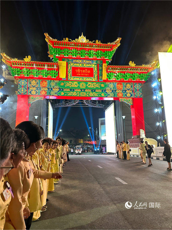 夜幕降臨,牌樓揭幕儀式正式開啟,馬路兩邊站滿了前來觀看的嘉賓。隨著禮賓隊(duì)音樂響起,泰國國王哇集拉隆功和王后素提達(dá)為曼谷中國城崇圣牌樓揭幕。
