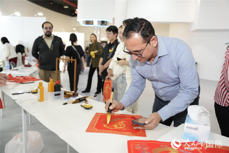 圖為一位外國朋友學寫書法。人民網 塔里克·易卜拉欣攝