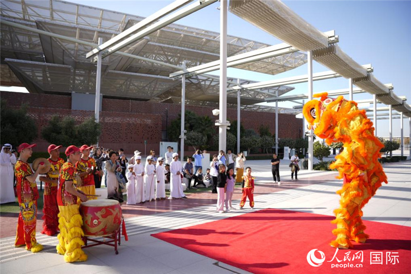 喜慶的舞獅表演吸引眾多阿聯酋當地民眾欣賞。人民網 塔里克·易卜拉欣攝