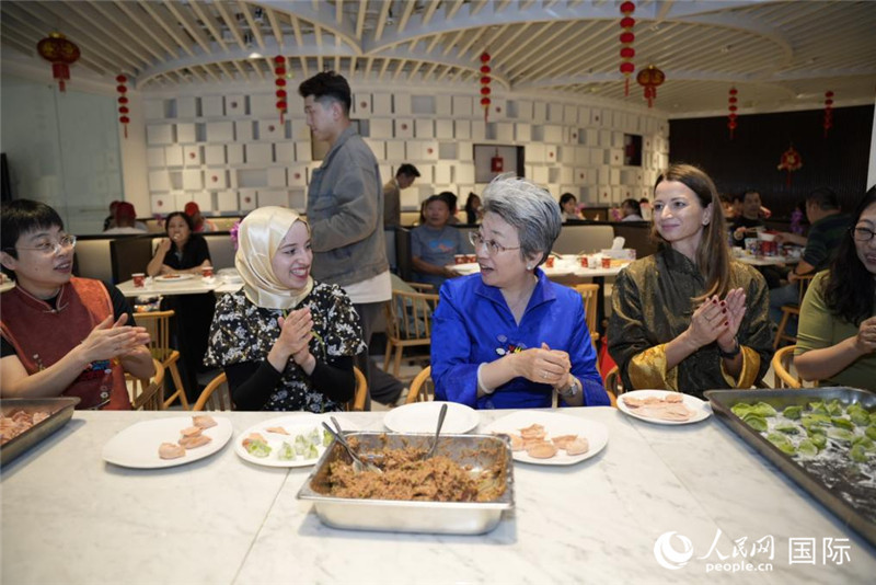 中國駐迪拜總領事歐渤芊與參與活動的外國友人一同包餃子。人民網 塔里克·易卜拉欣攝