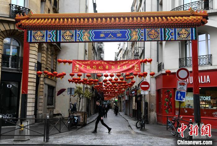 圖為已建成的巴黎中心區(qū)華人街臨時牌樓?!±钛?攝