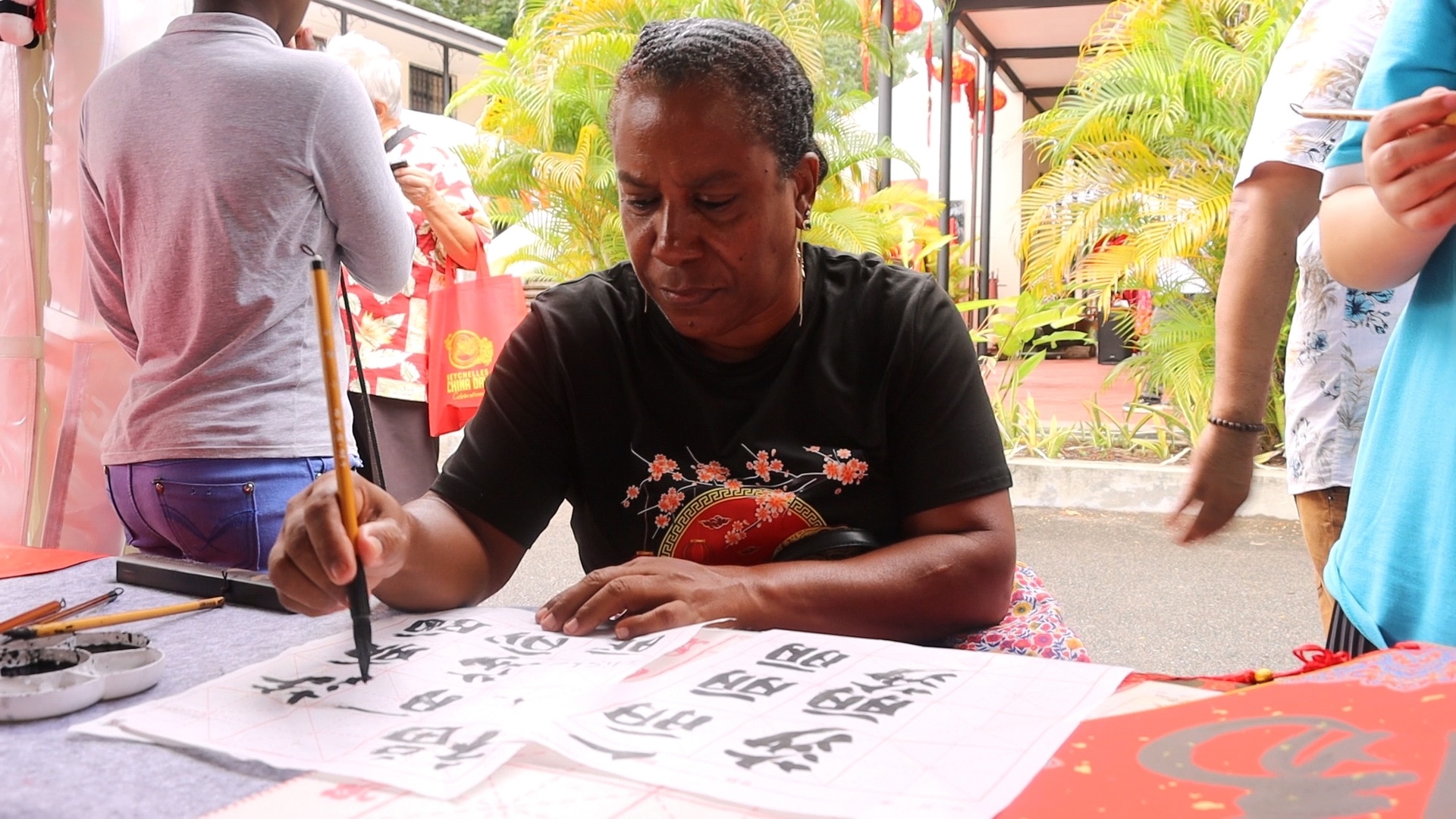 一名當(dāng)?shù)孛癖娫隗w驗(yàn)書(shū)法。中國(guó)駐塞舌爾大使館供圖