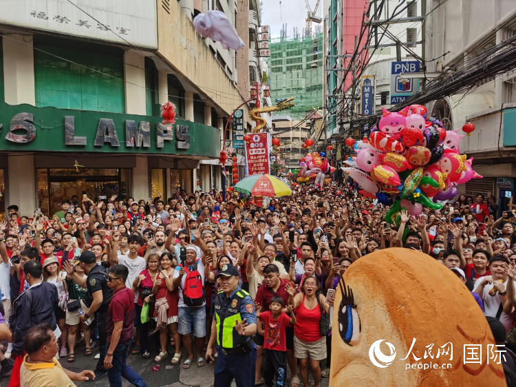 活動當(dāng)天,馬尼拉中國城到處張燈結(jié)彩,人頭攢動。巡游隊伍由四十多輛精心裝扮、五彩繽紛的花車組成,浩浩蕩蕩,綿延百余米。百萬民眾參與巡游活動,人群簇?fù)碓谲囮犞車宦窂鸟R尼拉市郵政局出發(fā),經(jīng)過瓊斯橋、中菲友誼門、岷倫洛教堂、王彬街等地,最終抵達(dá)美加廣場。黃溪連大使夫婦及華社領(lǐng)導(dǎo)在花車上向民眾揮手致意,送上新春祝福,并派發(fā)新年紅包、中菲友誼衫及糖果、年糕等節(jié)慶食品。沿途民眾群情沸騰,歡呼雀躍,爭相用中文互送祝福,并與花車合影留念。