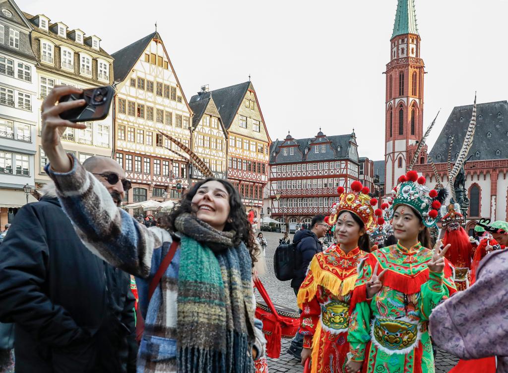 1月31日,在德國(guó)法蘭克福,一名女子與潮汕英歌舞隊(duì)演員在法蘭克福市政廳前合影。新華社記者 張帆 攝