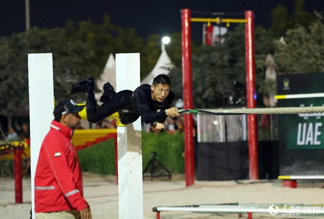 中國特警隊(duì)員在比賽中翻越障礙。人民網(wǎng)記者 任皓宇攝
