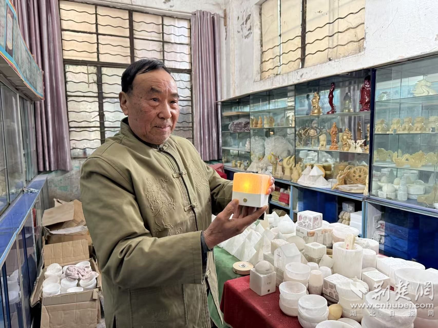 上世紀(jì)90年代,由于改革開放政策,應(yīng)城石膏銷路驟然寬廣,相關(guān)工藝產(chǎn)業(yè)迅速發(fā)展起來(lái)。應(yīng)城市工藝膏雕廠成立,伍佰林被任命為廠長(zhǎng)?!白铋_始是做石膏枕頭,市場(chǎng)需求很大,后來(lái)慢慢做文房四寶、工藝擺件、浮雕壁畫這些類型?!蔽榘亓纸榻B,隨著科技進(jìn)步和市場(chǎng)需求變化,膏雕工藝品也在不斷創(chuàng)新,融入一些聲光電技術(shù),比如石膏香氛、石膏臺(tái)燈等等產(chǎn)品,受到很多年輕人的喜愛。
