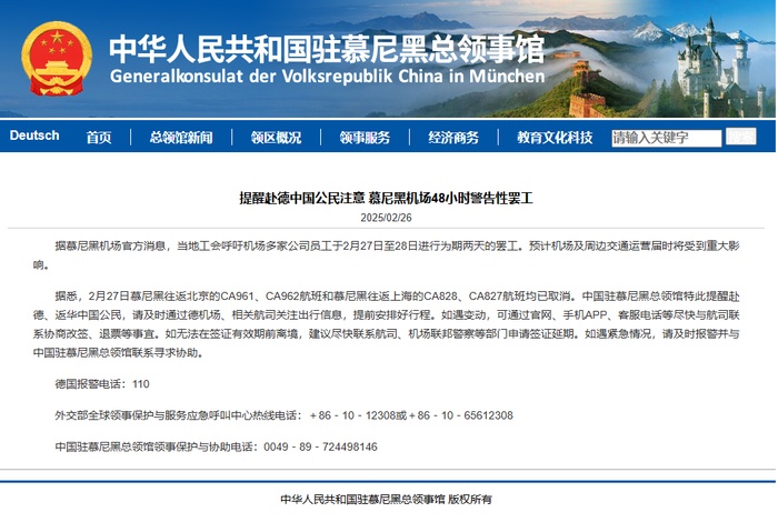 據(jù)悉,2月27日慕尼黑往返北京的CA961、CA962航班和慕尼黑往返上海的CA828、CA827航班均已取消。中國駐慕尼黑總領館特此提醒赴德、返華中國公民,請及時通過德機場、相關航司關注出行信息,提前安排好行程。如遇變動,可通過官網(wǎng)、手機APP、客服電話等盡快與航司聯(lián)系協(xié)商改簽、退票等事宜。如無法在簽證有效期前離境,建議盡快聯(lián)系航司、機場聯(lián)邦警察等部門申請簽證延期。如遇緊急情況,請及時報警并與中國駐慕尼黑總領館聯(lián)系尋求協(xié)助。