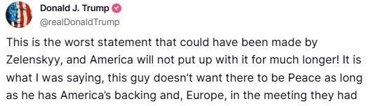 3日晚些時候,美國總統(tǒng)特朗普在社交媒體上發(fā)文,對澤連斯基的最新視頻聲明作出回應。特朗普表示,烏克蘭總統(tǒng)澤連斯基的聲明可能是他做出的“最糟糕的”聲明,美國“不會再容忍更久了”。