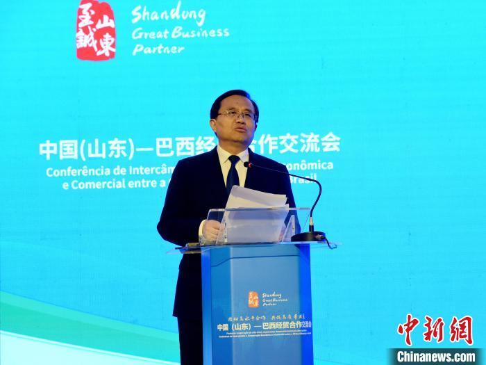 當(dāng)?shù)貢r(shí)間3月10日,巴西圣保羅,山東省副省長(zhǎng)宋軍繼在中國(山東)-巴西經(jīng)貿(mào)合作交流會(huì)上致辭。記者林春茵攝