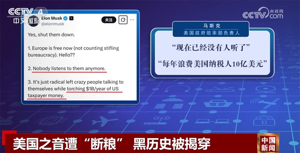 事實上,“美國之音”被噤聲早有跡象。2月9日,美國政府效率部負責人馬斯克在社交媒體平臺發(fā)文稱,美國之音電臺、自由歐洲電臺和自由廣播電臺等機構“現在已經沒人聽了”,它們“每年浪費美國納稅人10億美元?!?/p>