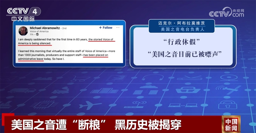 美國之音電臺負責人邁克爾·阿布拉莫維茨15日在社交媒體上說,他手下全部1300多名記者、制片人和助理幾乎都已被強制“行政休假”“美國之音目前已被噤聲” 。