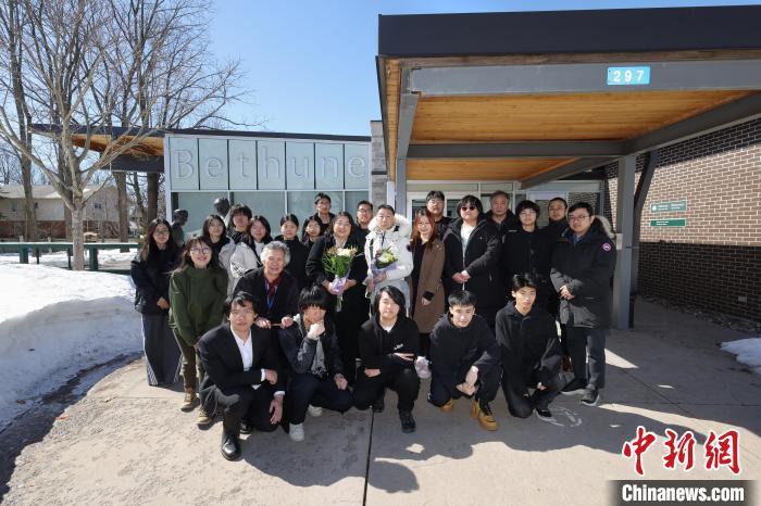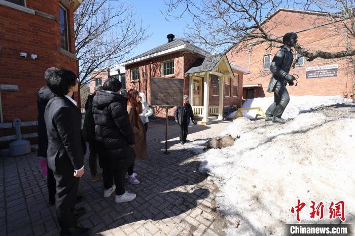 當(dāng)?shù)貢r(shí)間3月17日,位于白求恩家鄉(xiāng)加拿大安大略省穆斯科卡地區(qū)的杜威(Dewey)白求恩醫(yī)學(xué)護(hù)理學(xué)院和杜威公學(xué)舉行白求恩大夫誕辰135周年紀(jì)念活動(dòng)。圖為校方師生和大多倫多地區(qū)華人社區(qū)代表在白求恩出生地穆斯科卡地區(qū)格雷文赫斯特鎮(zhèn)參觀白求恩塑像。中新網(wǎng)記者 余瑞冬 攝