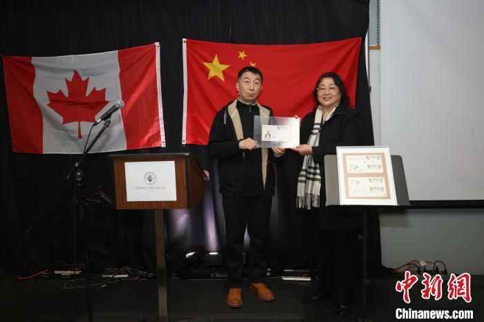 當(dāng)?shù)貢r(shí)間3月17日,位于白求恩家鄉(xiāng)加拿大安大略省穆斯科卡地區(qū)的杜威白求恩醫(yī)學(xué)護(hù)理學(xué)院和杜威公學(xué)舉行白求恩大夫誕辰135周年紀(jì)念活動(dòng)。圖為著名畫家、郵票設(shè)計(jì)家劉向平(左)向校方捐贈(zèng)由其設(shè)計(jì)、中加兩國聯(lián)合發(fā)行的白求恩誕生一百周年郵票的紀(jì)念封。中新網(wǎng)記者 余瑞冬 攝