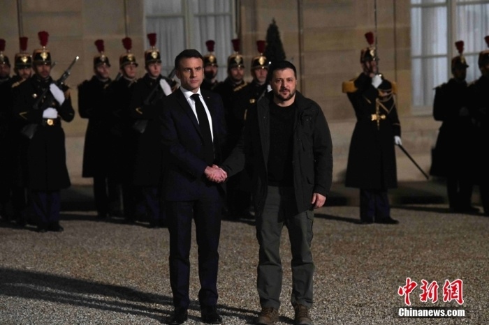 當(dāng)?shù)貢r(shí)間2024年2月16日晚,法國(guó)總統(tǒng)馬克龍?jiān)诎屠钀?ài)麗舍宮會(huì)見(jiàn)烏克蘭總統(tǒng)澤連斯基。中新社記者 李洋 攝