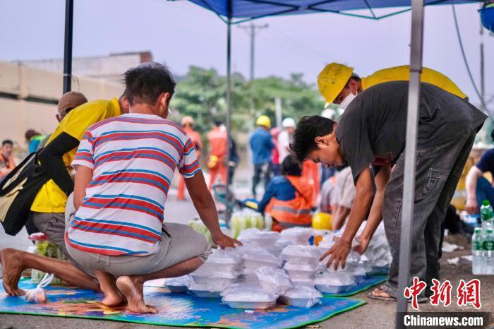 當(dāng)?shù)貢r(shí)間4月3日傍晚,緬甸曼德勒第30街附近一棟建筑因地震造成坍塌,中國(guó)救援隊(duì)持續(xù)救援,當(dāng)?shù)赜忻癖姙榫仍?duì)隊(duì)員準(zhǔn)備盒飯,感謝他們的幫助。 中新社記者 陳永諾 攝
