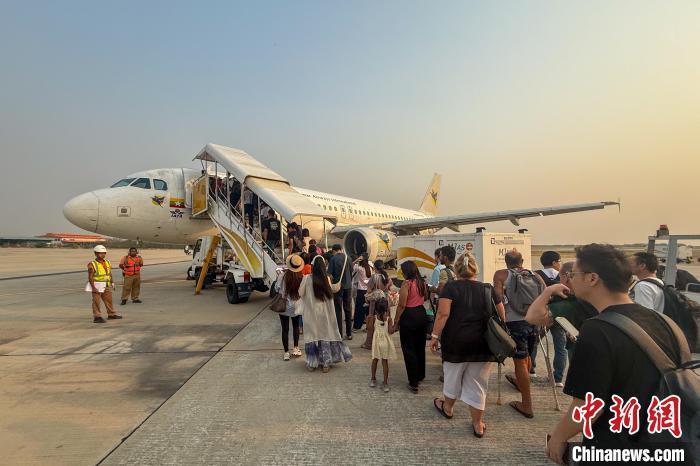當(dāng)?shù)貢r(shí)間4月4日,因“3·28”大地震暫時(shí)關(guān)閉的緬甸曼德勒國(guó)際機(jī)場(chǎng)恢復(fù)國(guó)內(nèi)航班,首班航班7時(shí)許起飛,前往仰光國(guó)際機(jī)場(chǎng)。圖為該趟航班乘客登機(jī)?!≈行律缬浾?陳永諾 攝