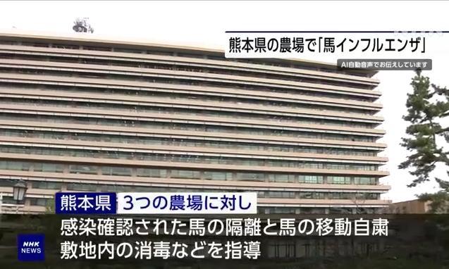 日本廣播協(xié)會(NHK)報道稱,目前,熊本縣正針對這3家養(yǎng)馬場采取隔離感染馬匹、避免轉移飼養(yǎng)馬匹、設施消毒等措施。