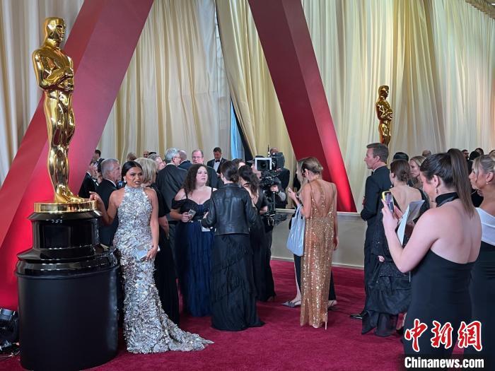 當(dāng)?shù)貢r間2025年3月2日,第97屆奧斯卡獎頒獎典禮在美國好萊塢杜比劇院舉行。圖為出席頒獎典禮的嘉賓在杜比劇院前與“小金人”合影留念?!≈行律缬浾?張朔 攝