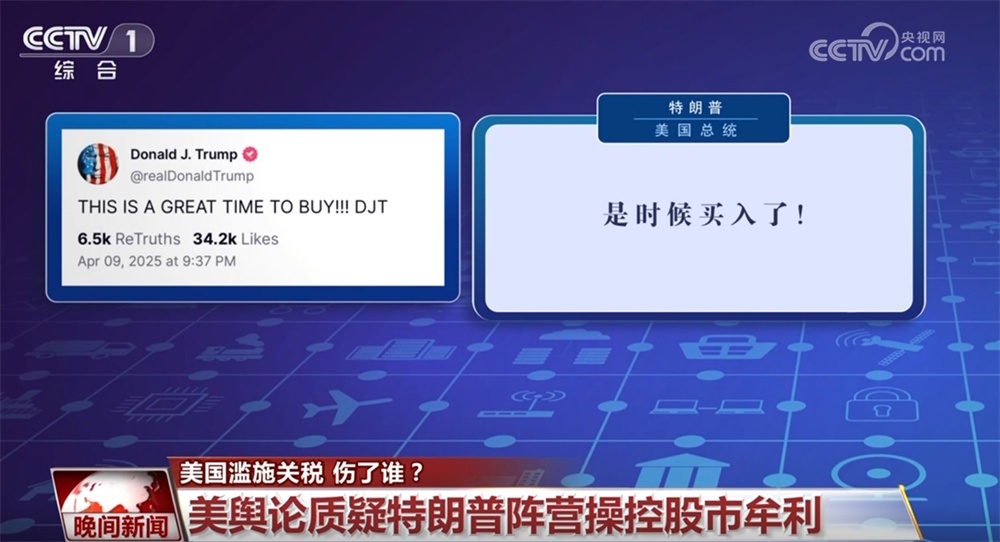 據美國媒體報道稱,特朗普在暫緩加征關稅決定公布前差不多3小時,也就是美股開盤后不久,通過社交媒體發(fā)文稱:“現(xiàn)在是買入的絕佳時機!DJT”。據美聯(lián)社說法,雖然特朗普有時以自己全名的英文縮寫DJT強調是自己親自所寫,但DJT也代表“真實社交”平臺母公司特朗普媒體科技集團的股票。該股價格當日收盤上漲了約22%,為大盤漲幅的兩倍左右。特朗普持股53%,估算下來,特朗普家族因這波股市暴漲一天就獲利4億美元以上。社交媒體視頻顯示,當天特朗普在白宮還頗為驕傲地介紹身邊的美國富豪在股市里大賺一筆。