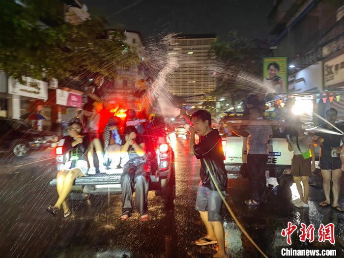 4月14日晚,柬埔寨首都金邊市打水仗的民眾。中新社記者 楊強(qiáng) 攝