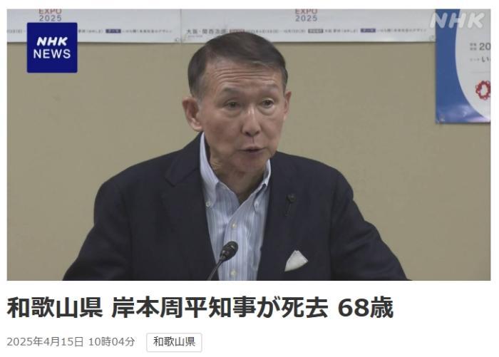 中新網4月15日電 據日本廣播協(xié)會(NHK)報道,當?shù)貢r間15日,日本和歌山縣知事岸本周平去世。一天前,他在位于和歌山市內的知事官邸被發(fā)現(xiàn)倒在地上,隨后被送往醫(yī)院。