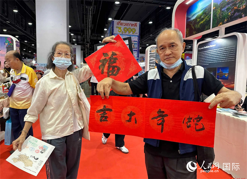 2025蛇年春節(jié),泰國(guó)市民展示他們領(lǐng)到的華人手寫春聯(lián)。人民網(wǎng)記者 簡(jiǎn)承淵攝
