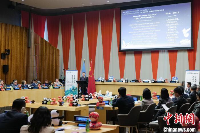 當(dāng)?shù)貢r(shí)間4月15日,2025年聯(lián)合國中文日系列活動(dòng)在紐約聯(lián)合國總部開幕。圖為DeepSeek創(chuàng)作的詩詞在活動(dòng)開幕式上的詩詞朗誦會(huì)亮相?!≈行律缬浾?王帆 攝