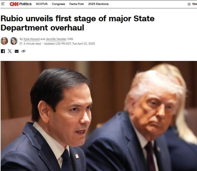 中新網(wǎng)4月23日電 綜合美媒報(bào)道,當(dāng)?shù)貢r(shí)間22日,美國(guó)國(guó)務(wù)卿魯比奧宣布,美國(guó)務(wù)院將實(shí)施全面重組計(jì)劃,落實(shí)美國(guó)總統(tǒng)特朗普宣揚(yáng)的“美國(guó)優(yōu)先”外交政策。