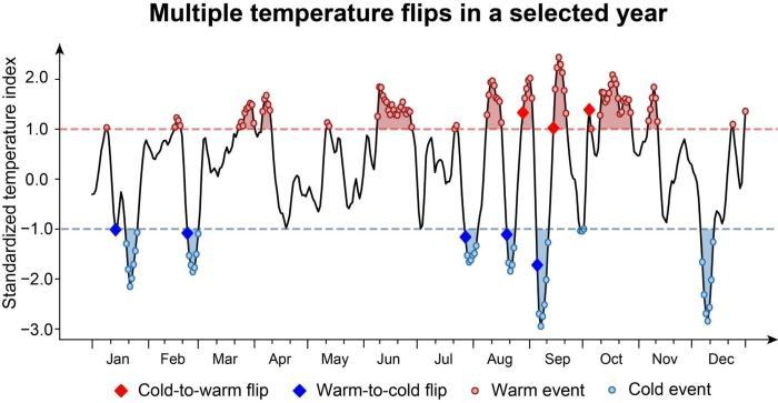 氣溫驟變是指氣溫在短時間內(nèi)從異常炎熱驟降至異常寒冷,或反向急升的突然變化。由于缺乏足夠時間去適應(yīng)和應(yīng)對,這類驟變可能會放大獨立的極端高溫或低溫事件對社會和自然系統(tǒng)造成的負(fù)面后果,影響人類和動植物健康、基礎(chǔ)設(shè)施及農(nóng)業(yè)生產(chǎn)等。盡管針對獨立的冷或暖事件的研究日益增多,但人們對二者之間快速轉(zhuǎn)變及其影響所知甚少。
