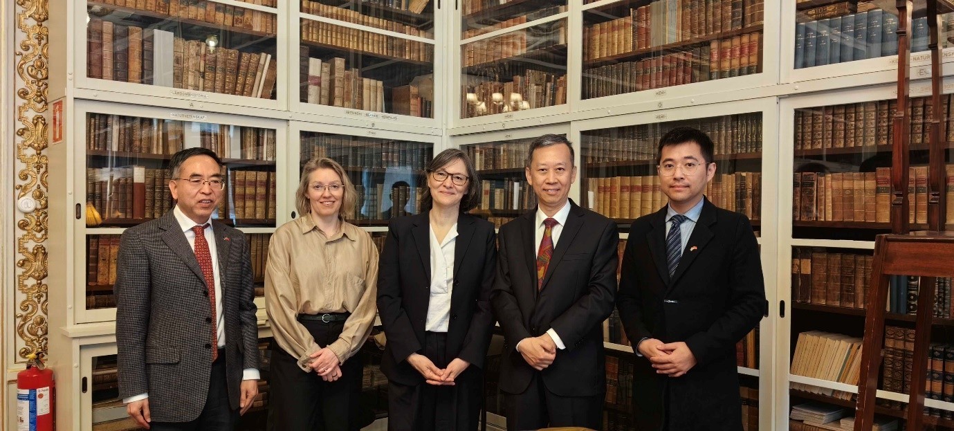 中國駐瑞典大使崔愛民(右二)會見瑞典皇家工程院院長塞爾格(中)。中國駐瑞典大使館供圖