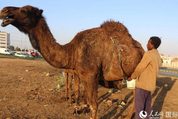 工人在給駱駝擠奶。人民網(wǎng) 納達爾·達烏德攝