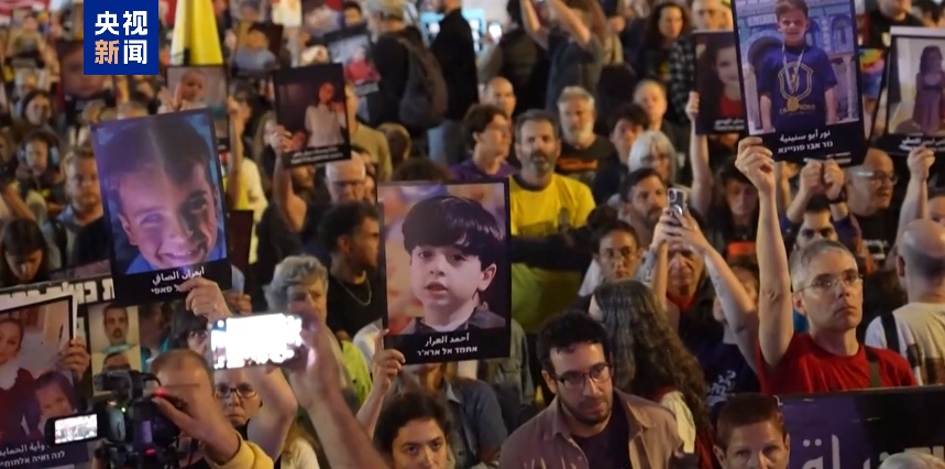 當(dāng)?shù)貢r(shí)間24日,數(shù)百名以色列民眾在特拉維夫舉行抗議??棺h者呼吁實(shí)現(xiàn)巴以和平,要求以色列政府結(jié)束當(dāng)前沖突,稱緩和沖突有助于以色列被扣押人員獲釋。