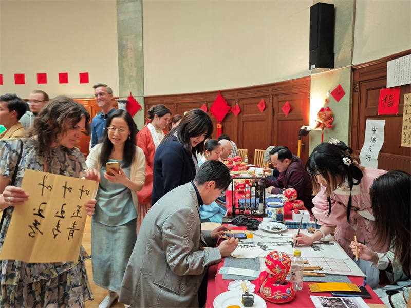 隨后,來賓們根據(jù)自己的興趣進(jìn)行不同的中華文化體驗(yàn),來自瑞典的青少年下起了象棋;在書法展示區(qū),大家排起長隊(duì),等待用中文寫下自己的名字,學(xué)習(xí)瑞典、中國、中瑞友好等漢字的寫法;在中國畫展示區(qū),大家一起做版畫、畫扇面,欣賞工筆畫的精巧,以及寫意畫的意蘊(yùn);在漢服展示和手工制作區(qū)域,來賓踴躍試穿漢服并合影,制作燈籠、剪紙等中華傳統(tǒng)工藝品。
