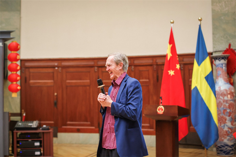 瑞典著名語言文化學(xué)者延斯·奧爾伍德教授發(fā)言。中國駐哥德堡總領(lǐng)館供圖