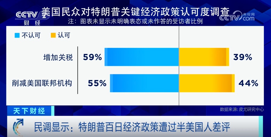 近期的多項民調(diào)還顯示出,特朗普的支持率在下降,多數(shù)美國民眾不認(rèn)同他的關(guān)鍵經(jīng)濟(jì)政策。對于特朗普的總體工作表現(xiàn),皮尤研究中心的最新民調(diào)顯示,59%的美國人表示不認(rèn)可,支持率僅為40%,較2月份下降了7個百分點。 而具體到其增加關(guān)稅,和削減美國聯(lián)邦機(jī)構(gòu)例如裁員等措施上,超過半數(shù)的受訪者也表示不認(rèn)可特朗普的政策,不認(rèn)可的比例分別為59%和55%。