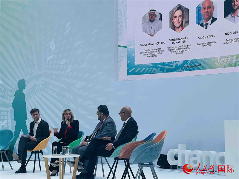 法國能源轉(zhuǎn)型部長、沙特環(huán)境副部長在開幕式中致辭。人民網(wǎng)記者 何蒨攝