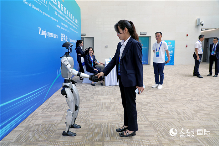 參觀者在國(guó)際醫(yī)學(xué)創(chuàng)新交流合作展上與機(jī)器人互動(dòng)。人民網(wǎng)記者 趙益普攝