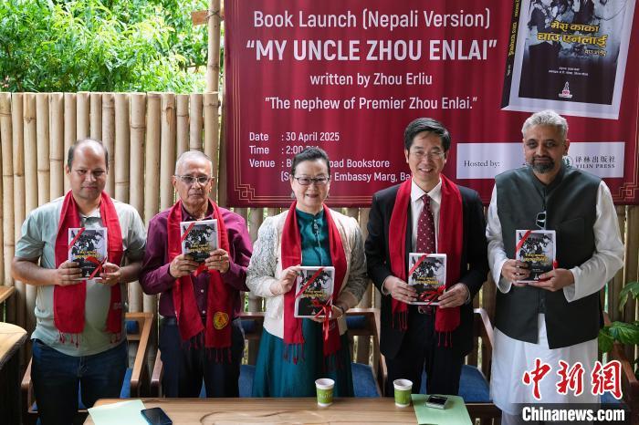 當(dāng)?shù)貢r(shí)間4月30日,《我的七爸周恩來(lái)》尼泊爾語(yǔ)版首發(fā)儀式在加德滿都“一帶一路”書(shū)店舉行,中國(guó)駐尼泊爾大使館臨時(shí)代辦王欣(右二)、《我的七爸周恩來(lái)》作者周爾鎏之女周蓉(中)、尼泊爾當(dāng)代出版公司總裁高塔姆(右一)等嘉賓手持尼泊爾語(yǔ)版《我的七爸周恩來(lái)》合影。中新社記者 崔楠 攝