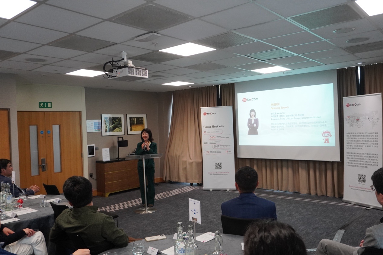 中國聯(lián)通歐洲大區(qū)總經(jīng)理薛文霞介紹聯(lián)通在歐洲的發(fā)展規(guī)劃?;顒?dòng)主辦方供圖