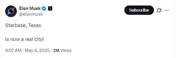 太空探索技術(shù)公司首席執(zhí)行官埃隆·馬斯克在社交媒體發(fā)文:“得克薩斯的星艦基地,現(xiàn)在是一座真正的城市了!”。