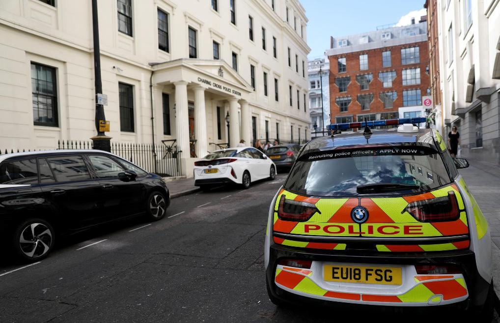 2022年8月8日,在英國倫敦,一輛警車停在警察局門口。新華社記者李穎攝