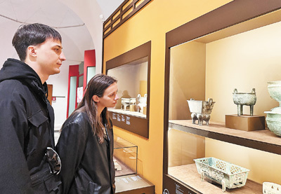 5月5日,俄羅斯觀眾在莫斯科參觀“食味中華——中華古代飲食文化展”。