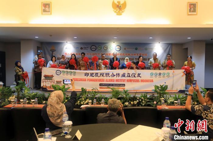圖為與會嘉賓為印尼孔子學(xué)院聯(lián)合體成立剪彩。記者 李志全 攝