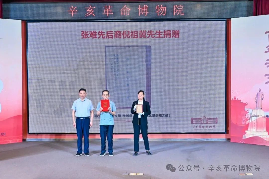 魏德勛院長(zhǎng)向張難先外孫倪祖冀先生頒發(fā)收藏證書