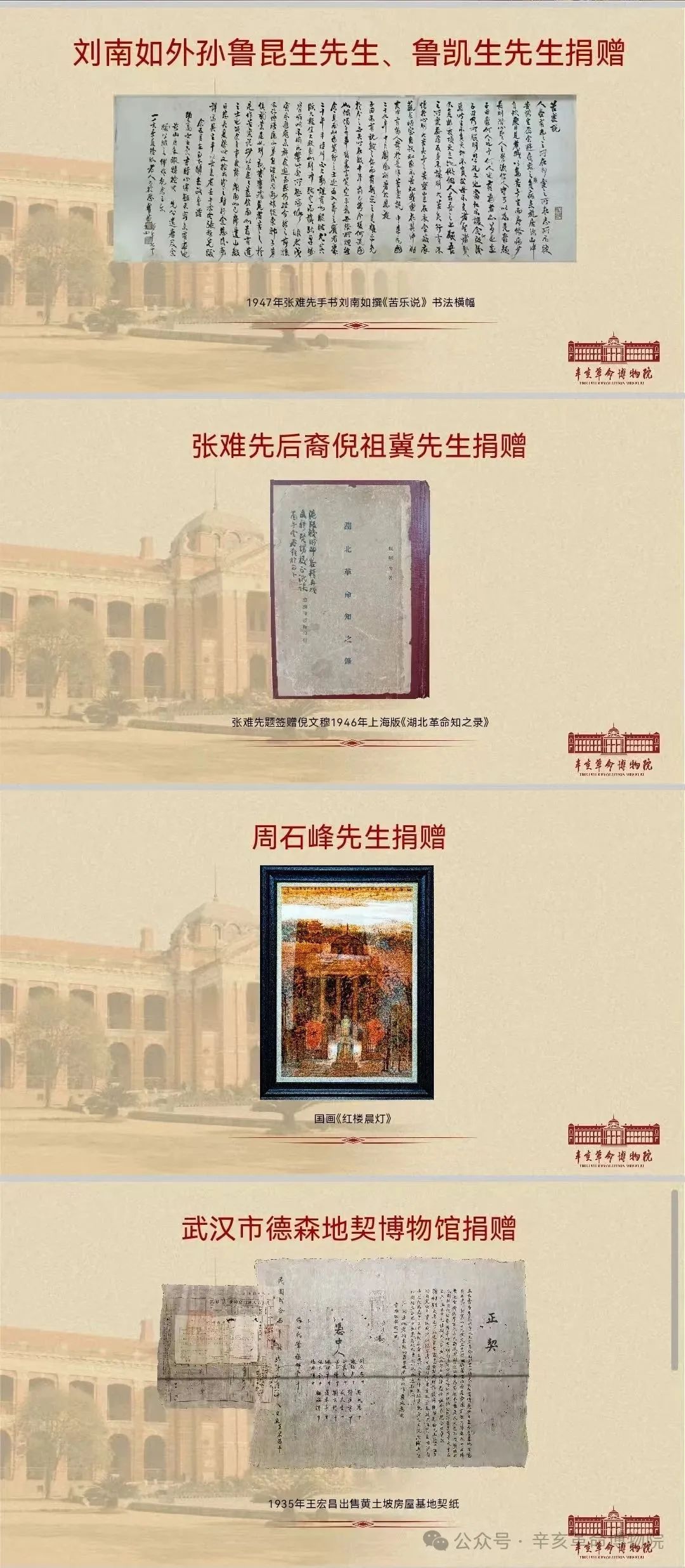 去年下半年以來,在辛亥后裔及社會(huì)各界人士的關(guān)心和支持下,我院已接收文物捐贈(zèng)多次,涉及文物資料10余件(套)。其中,劉南如外孫魯昆生先生、魯凱生先生捐贈(zèng)“1947年張難先手書劉南如撰《苦樂說》書法橫幅”1件(套);張難先外孫倪祖冀先生捐贈(zèng)“張難先題簽贈(zèng)倪文穆1946年上海版《湖北革命知之錄》”1件(套);知名畫家周石峰先生捐贈(zèng)其本人創(chuàng)作的國(guó)畫作品《紅樓晨燈》1件(套),武漢市德森地契博物館捐贈(zèng)“首義路149號(hào)地契”1件(套)。這些捐贈(zèng)進(jìn)一步豐富了我院藏品體系,為我院各項(xiàng)業(yè)務(wù)工作進(jìn)一步高質(zhì)量發(fā)展奠定了堅(jiān)實(shí)基礎(chǔ)。