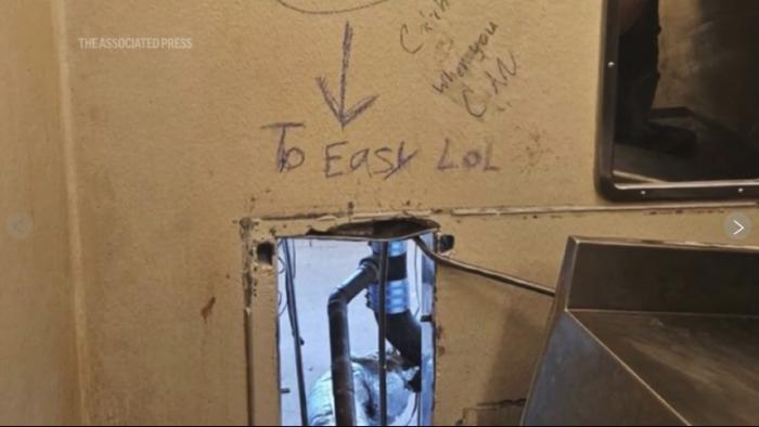 《華盛頓郵報(bào)》指出,警方公布的所謂逃跑路線照片顯示,一間牢房的金屬馬桶被推到一邊,露出了一個(gè)洞口。洞口上方還留有涂鴉,例如“太容易了,哈哈”和“有機(jī)會(huì)再來(lái)抓我們”。