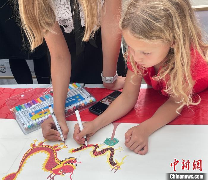 展覽邀請小觀眾現(xiàn)場創(chuàng)作一幅畫卷,兩位比利時(shí)小朋友繪制了兩條“中國龍”。中新網(wǎng)記者 德永健 攝