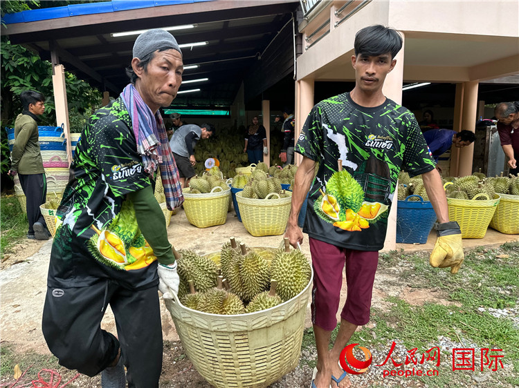 園內(nèi)榴蓮樹碩果壓枝,園農(nóng)們開心地表示,今年榴蓮大豐收,收購價格已漲至120泰銖/公斤,今天采摘的榴蓮已全部被買走,通過鐵路、公路、水運(yùn)等多種方式運(yùn)輸,最快3天就能抵達(dá)中國,感謝中國政府特事特辦促進(jìn)泰榴蓮?fù)P(guān)順暢。
